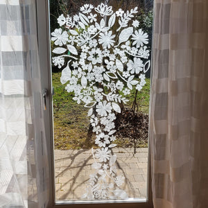 Frei und ungezwungen ranken unterschiedlichste Blumen und Blätter aneinander vorbei und bilden immer wieder neue, dekorative und spannende Formationen. Die Pflanzen sind stark stilisiert und vermitteln eine zeitgemässe Ästhetik. Die florale Frühlings- und Sommerdeko für Ihre Fenster.